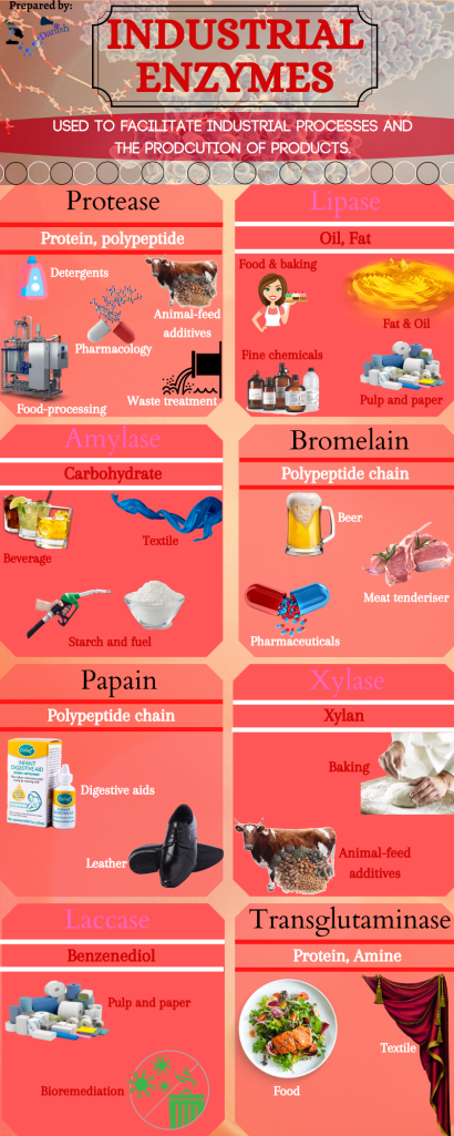 The industrial uses of enzymes are also increasing since they are being used in the production of biofuels and biopolymers. The enzymes can be harvested from microbial sources or can be made synthetically. The below infographic shows the different types of industrial enzymes together with their applications in industry. Let’s take a look!