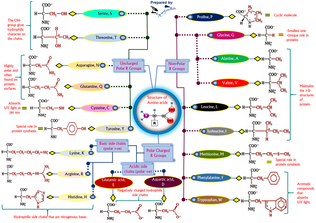 There are 20 common amino acid structures in total but they can also be found in a more complex form. All of the 20 amino acids can be referred below in the form of mind map. Take a look!